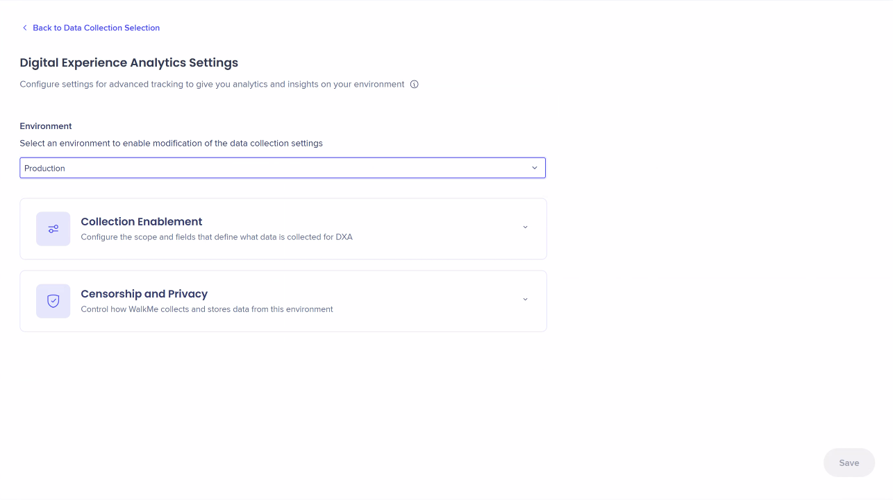 Vous pouvez accéder et modifier ces paramètres à partir de la page du niveau de collecte des données dans le Centre d'administration WalkMe.