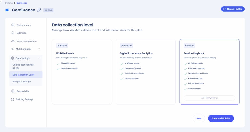 La collecte des données dans WalkMe détermine la quantité et le type de données d'interaction utilisateur capturées dans les environnements. Ces paramètres sont configurés par environnement (par exemple, Production et Test) et contrôlent quelles données sont collectées, quand et à partir d'où.