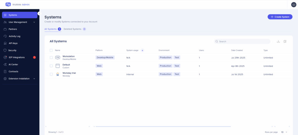 Le centre d'administration WalkMe est accessible directement à partir de l'éditeur ou en naviguant à :