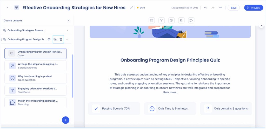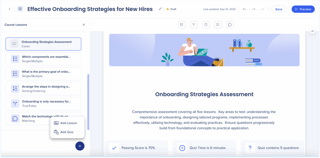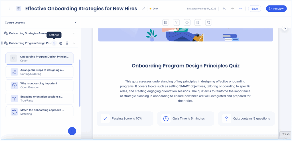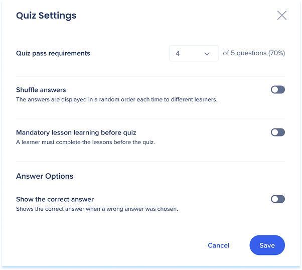 - Apprentissage obligatoire des leçons avant le quiz : activez-le pour exiger que les apprenants terminent les leçons avant de commencer le quiz