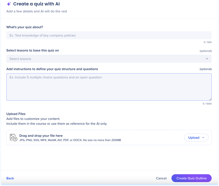 - Créez avec l'IA : utilisez les leçons, les instructions ou les fichiers téléchargés comme entrée, et l'IA générera le quiz en fonction de ces éléments