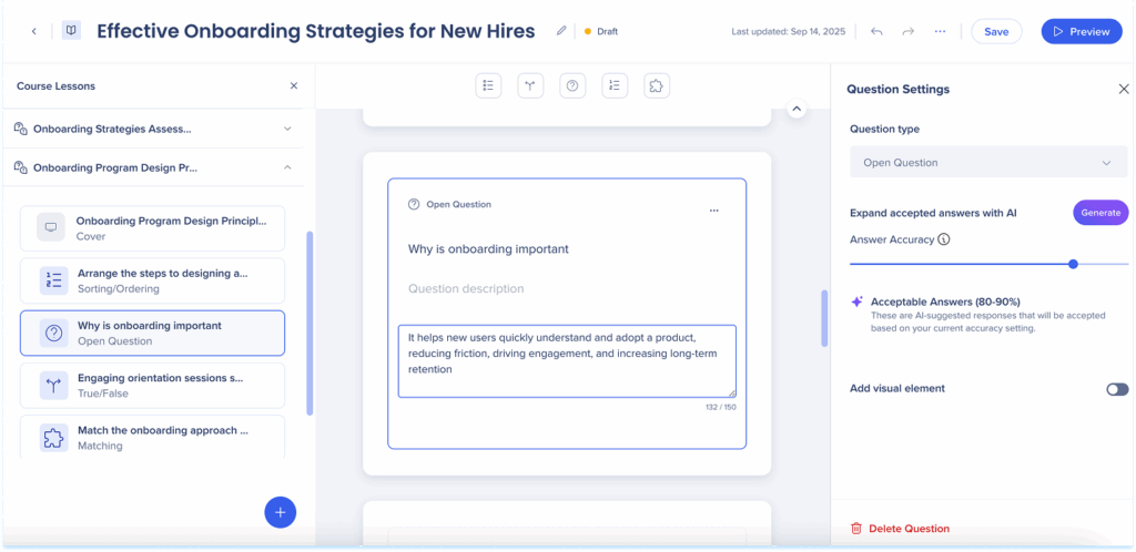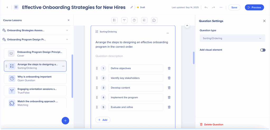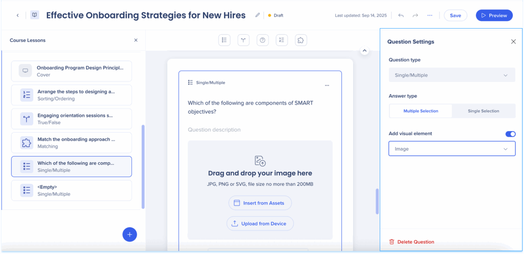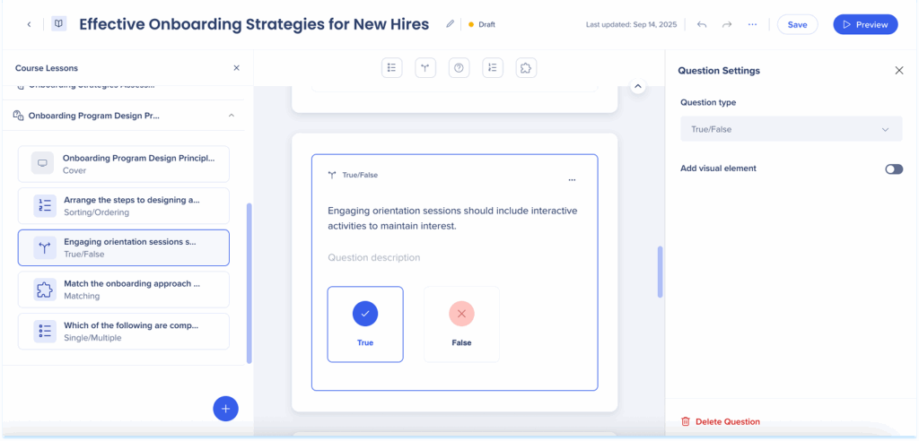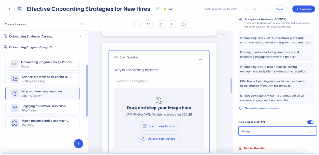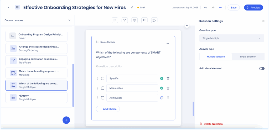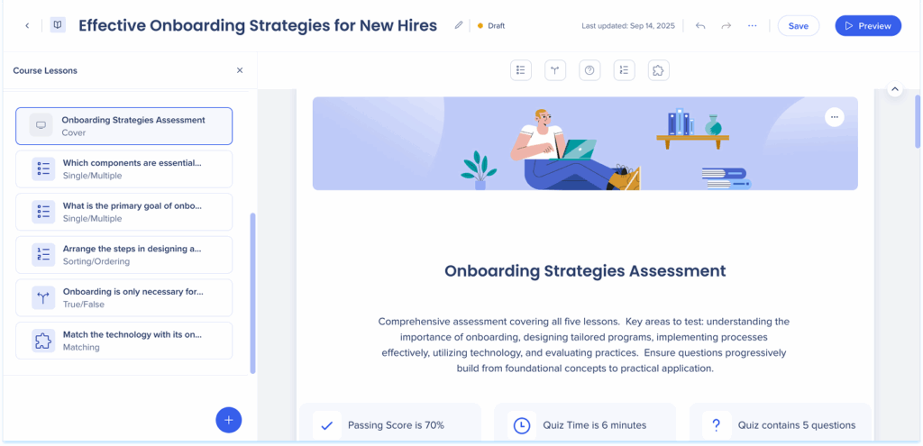 Vous pouvez créer des quiz à partir de zéro ou utiliser l'assistance d'IA pour générer des questions en fonction des cours ou du matériel téléchargé. Les apprenants vivent les quiz comme des interactions étape par étape, avec les exigences de notation et de réussite définies dans les paramètres du quiz.