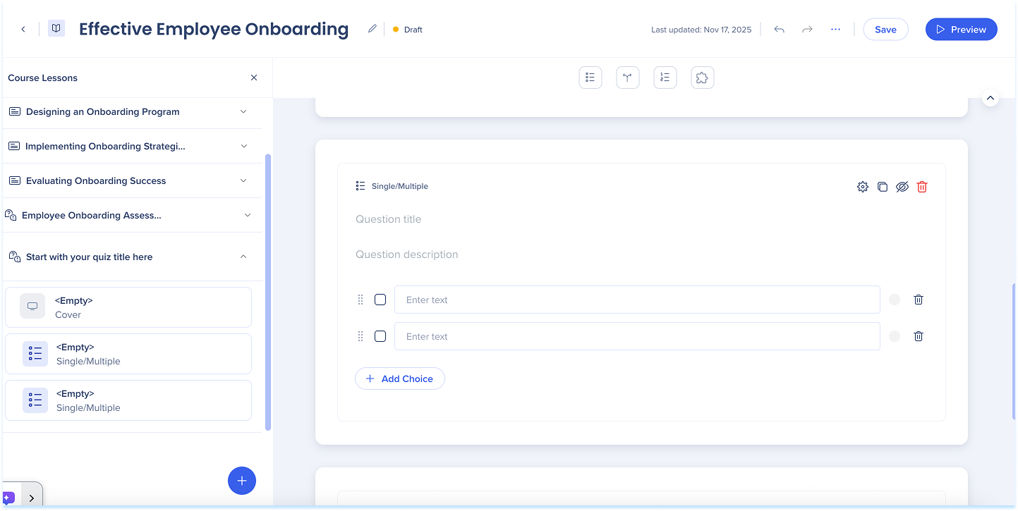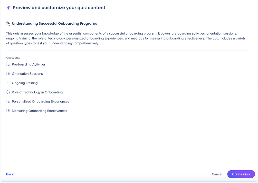 Les quiz vous permettent de créer des évaluations qui testent les connaissances, renforcent l'apprentissage et fournissent des commentaires directement dans le flux d'apprentissage. Ils fournissent un moyen simple de vérifier la compréhension et de garder les apprenants activement engagés tout au long de leur formation.