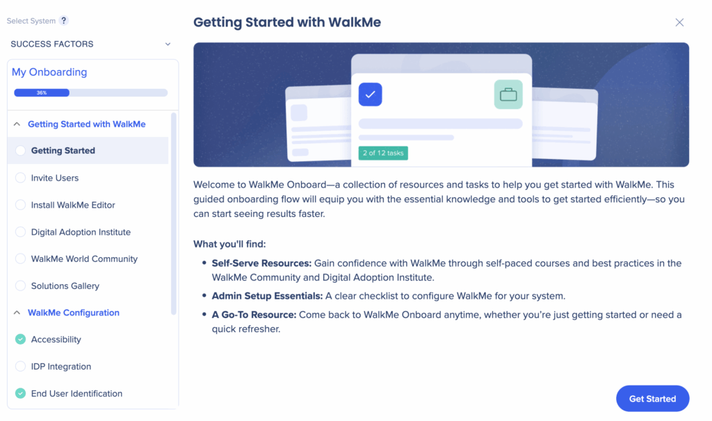 WalkMe Onboard est une collection de ressources et de tâches pour vous aider à faire vos débuts avec WalkMe. Ce flux d'onboarding guidé vous permettre d'acquérir des connaissances et des outils essentiels pour démarrer efficacement et obtenir des résultats plus rapidement.