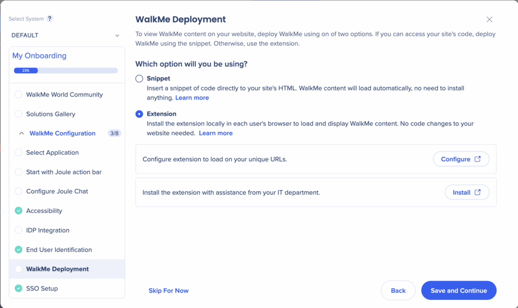 Pour afficher le contenu WalkMe sur votre site Web, déployez WalkMe en utilisant l'une des deux options suivantes. Si vous pouvez accéder au code de votre site, déployez WalkMe en utilisant le snippet. Le cas échéant, utilisez l'extension.
