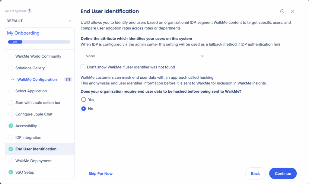 Si vous ne configurez pas l'intégration d'IDP, vous serez invité à choisir la façon dont WalkMe identifiera les utilisateurs, à l'aide d'un identifiant d'utilisateur unique (UUID).