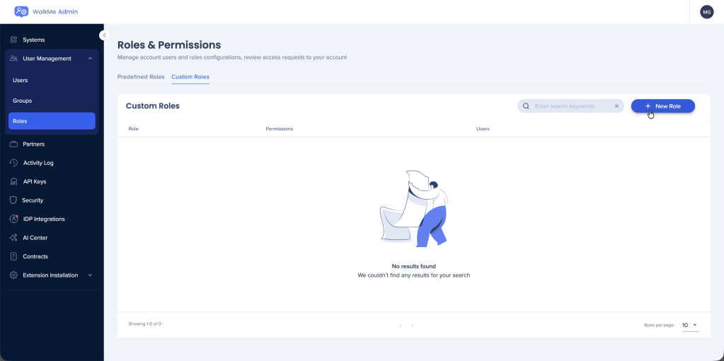 WalkMe管理センターのユーザー管理にある役割&権限ページから、これらの設定にアクセスし、変更することができます。