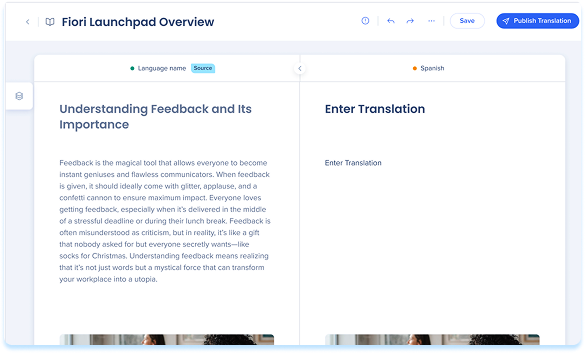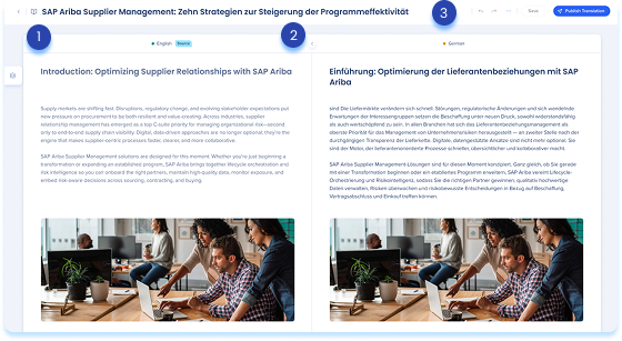 AI翻訳が利用できない場合、または完全な管理を希望する場合は、手動でコンテンツを翻訳できます。 ソースコンテンツの構造を維持しながら、ターゲット言語内のテキストとアセットを変更できます。
