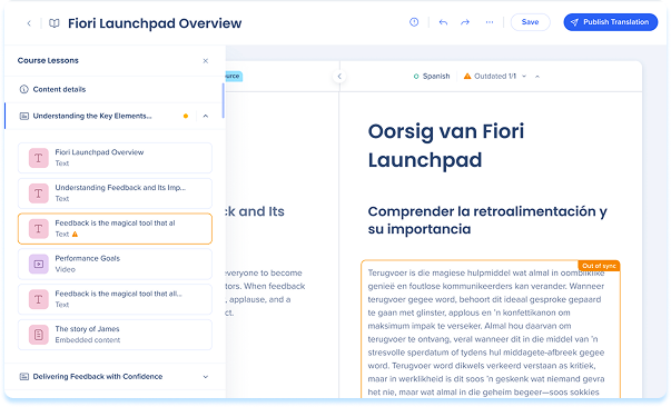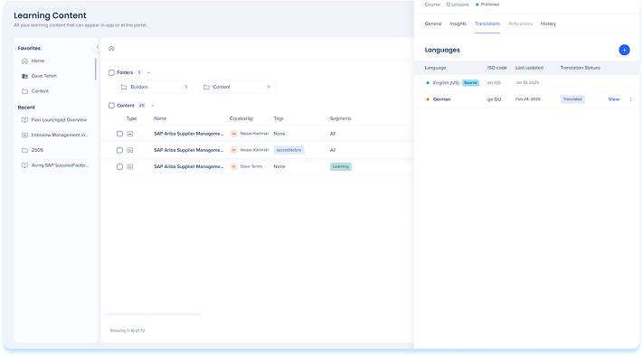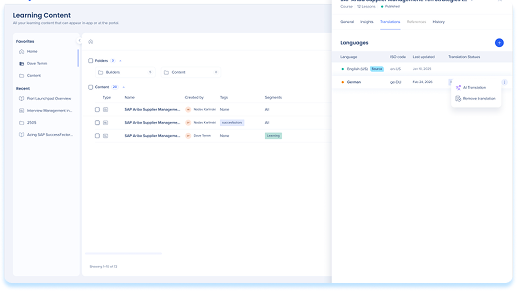 翻訳では、単一の学習アイテムから複数の言語バージョンの学習コンテンツを管理できます。 「学習コンテンツ」ページから言語の追加、翻訳ステータスの追跡、翻訳コンテンツへの直接アクセスを、1か所から行うことができます。 翻訳は、公開の準備が整っている言語、レビューが必要な言語、ソースコンテンツと同期していない言語を理解するのに役立ちます。 この記事では、翻訳の仕組み、翻訳の検索と管理方法を説明します。