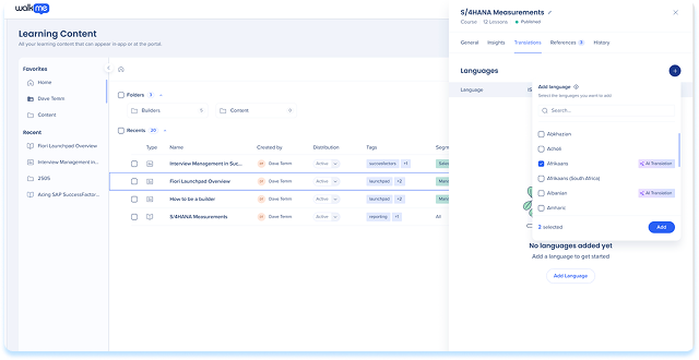 学習コンテンツ用の言語を追加し、管理するには、学習アイテムの「翻訳」タブを使用します。 言語は組織全体で共有され、他の学習アイテムに再利用できます。 この記事では、言語の追加、AI翻訳の可用性の理解、言語レベルのアクションの管理方法を説明します。