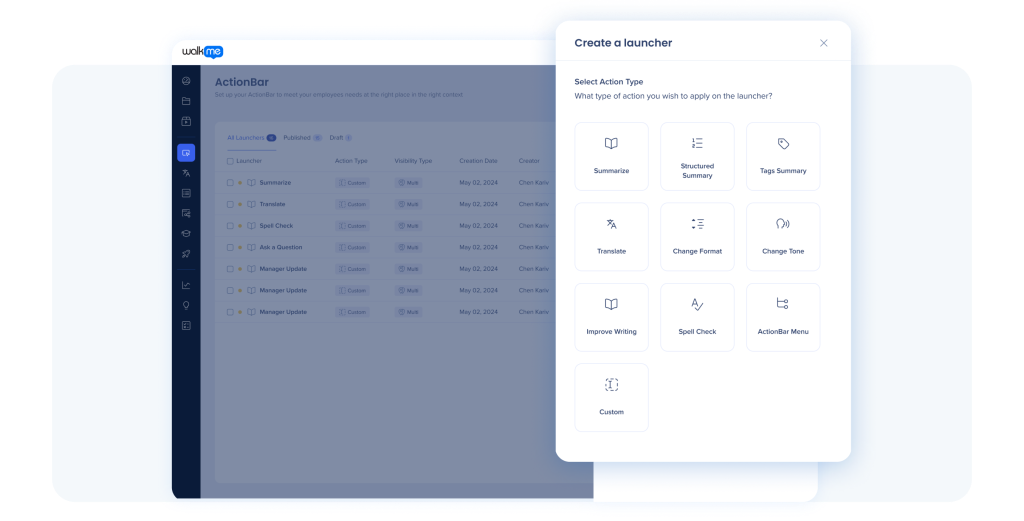 DAPのプロフェッショナルは、コンソールで常時オンにされるWalkMeXエクスペリエンスを設定できるようになりました。 アクションバーが誰のために表示されるシステムを定義します。 読み取り支援などのデフォルトのアクションを設定することで、ユーザーが大量の情報を処理し、カスタムAIロジックを定義してコンテキストに基づいて最適なアクションをトリガーします。例は次のとおりです。 競争的なアクションをトリガーします メールに競合他社に言及されている場合 ワークフローのパフォーマンスが新しい高みに達する様子を観察します。
