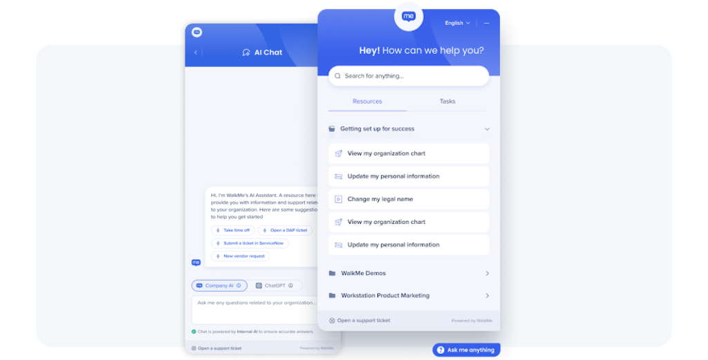 WalkMeXの顧客として、WalkMeXを配置して、あらゆるターゲットアプリケーションに「Pro」メニューを追加できます ユーザーの指先でコピーされます。 AIによる検索、アクションボットタスクの自動化、ChatGPTなどの公開チャットボットへのオプションのアクセス、DAPコンテンツがすべて便利で集中的な場所に統合されたAIチャットエクスペリエンスを提供します。 1つのチャットですべてを管理します。