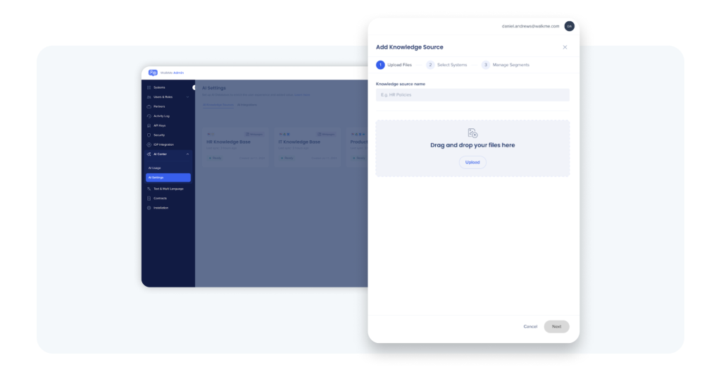 新四半期は、WalkMeXに含まれているAI回答のいくつかのアップグレードです または個々の購入で利用できます。 この四半期は、 ナレッジソースとしてアップロードできるファイルタイプのサポートを拡大しました — .pdf、.doc、.ppt.、.txtを.htmlに追加します。さらに、データのプライバシーと管理を強化し、カスタムユーザーグループを作成してナレッジソースに割り当てることで、ナレッジソースに割り当てられるよう、より詳細なデータにアクセスできるようにしました。