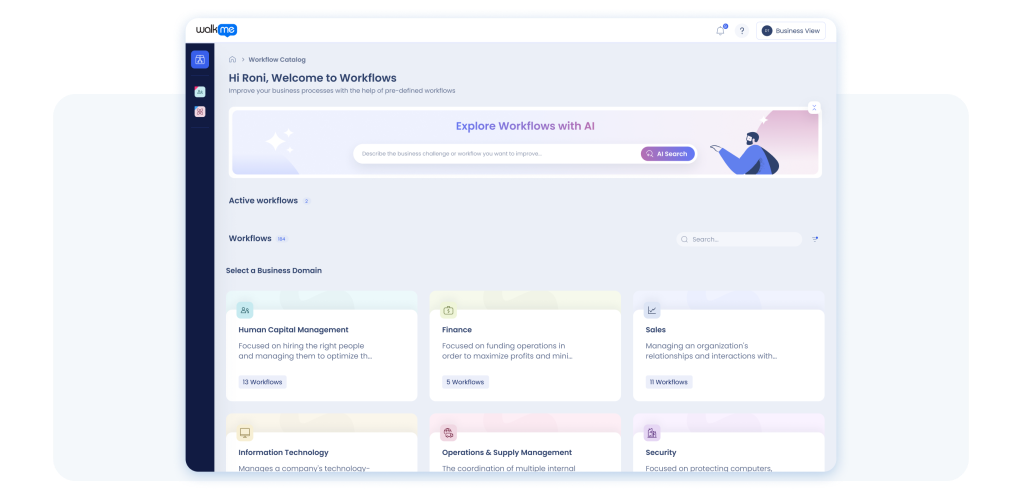 WalkMeの構築済みのソリューションのカタログは、新しいワークフローやアクセラレーターなど、拡大し続けています! 現在、1200種類以上の構築済みアクセラレーターは、20のビジネスドメインにわたって300種類以上の最も一般的なビジネスクリティカルなワークフローに対応するように設計されています。DAPフットプリントを戦略的に拡張する方法はこれまで以上にたくさんあります。