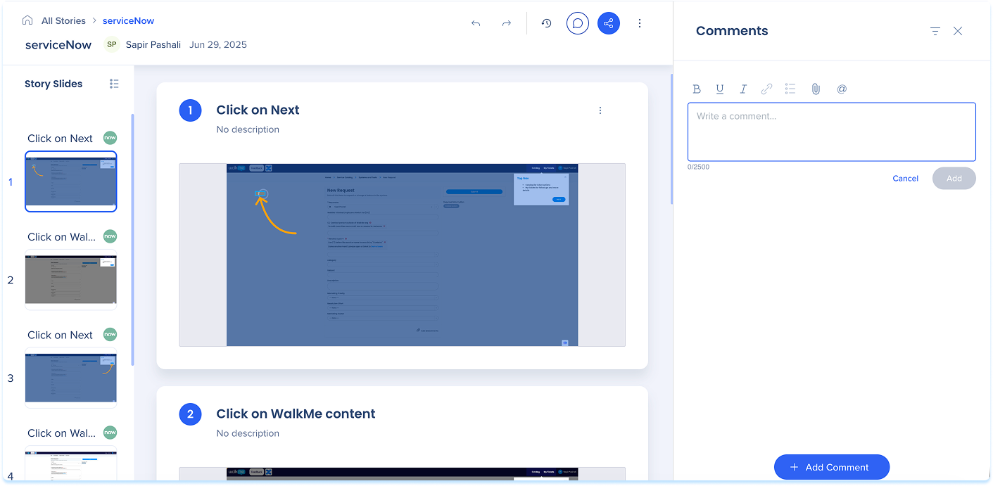 WalkMeストーリーでは、プロセスがステップバイステップガイドに自動変換されることにより、ワークフローのドキュメント化、共有、コラボレーションが可能です。これにより、WalkMeの機能を利用してオペレーションが強化されます。