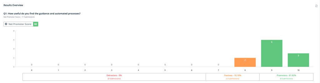 NPS調査はWalkMeのSurveysアプリで作成 します。 NPS形式の質問、フィードバックフィールド、およびカスタマイズ可能なメッセージを含むテンプレートを使用します。 質問回答データはInsightsで収集されます。 ダッシュボードはすべての計算を実行し、分かりやすいUIで結果を表示します。