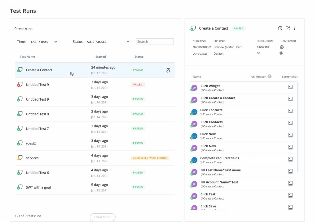すべてのテスト結果で、実行日付、ステータス、WalkMe環境、WalkMe言語、実行期間、画面解像度などの情報が保持されます。