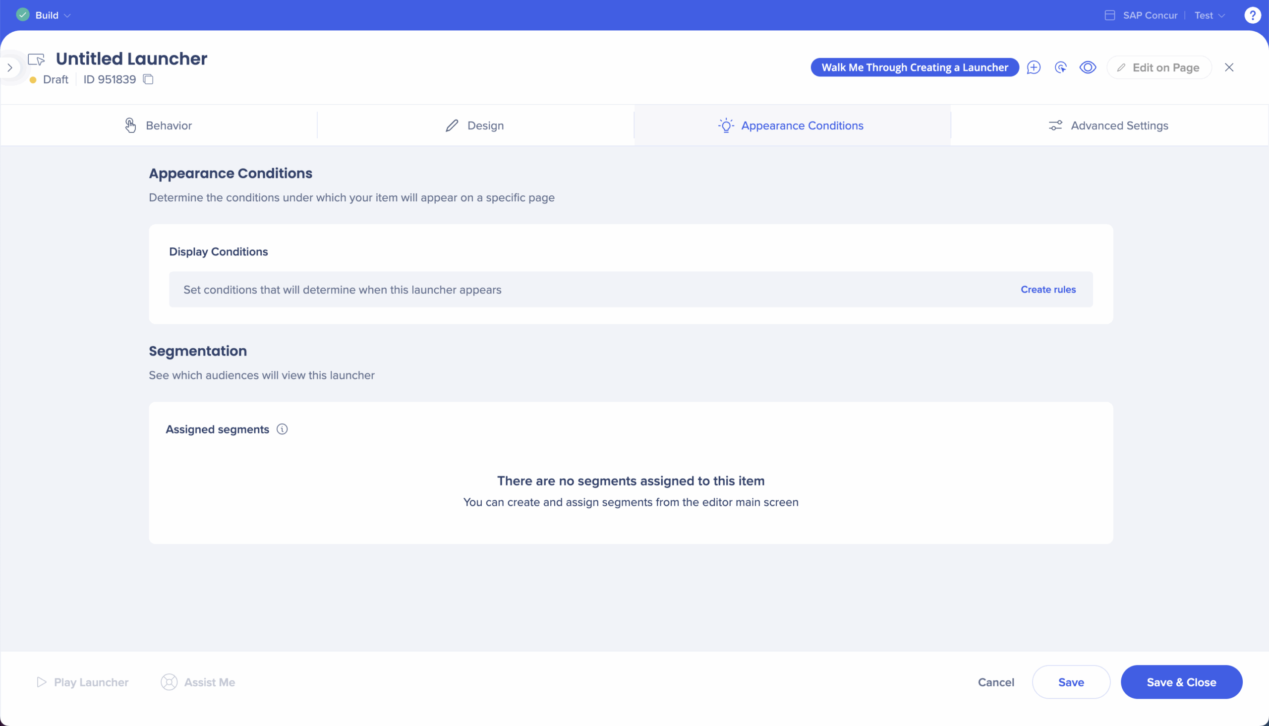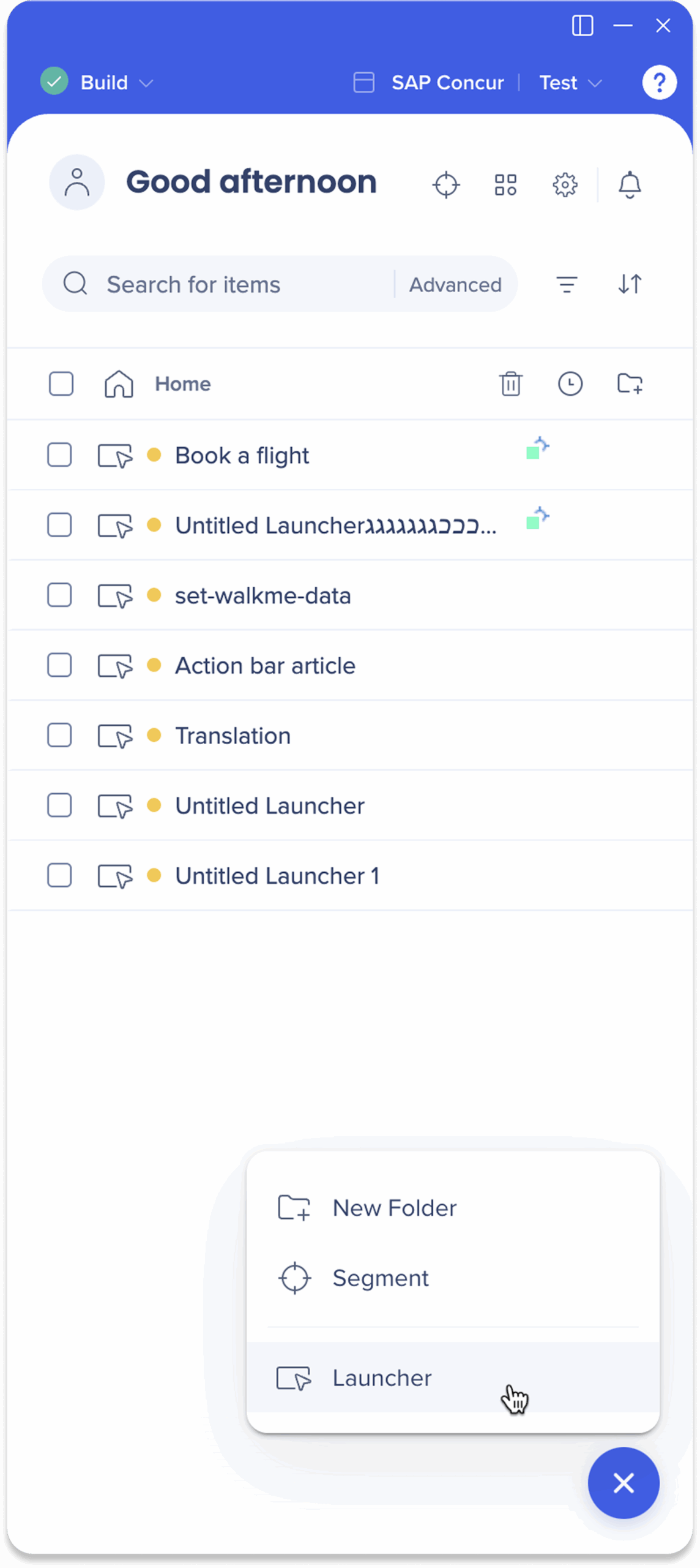 Use launchers in the WalkMe Editor for the Action Bar. You'll configure behavior, design, when/where it appears, and advanced recognition—then test and publish.