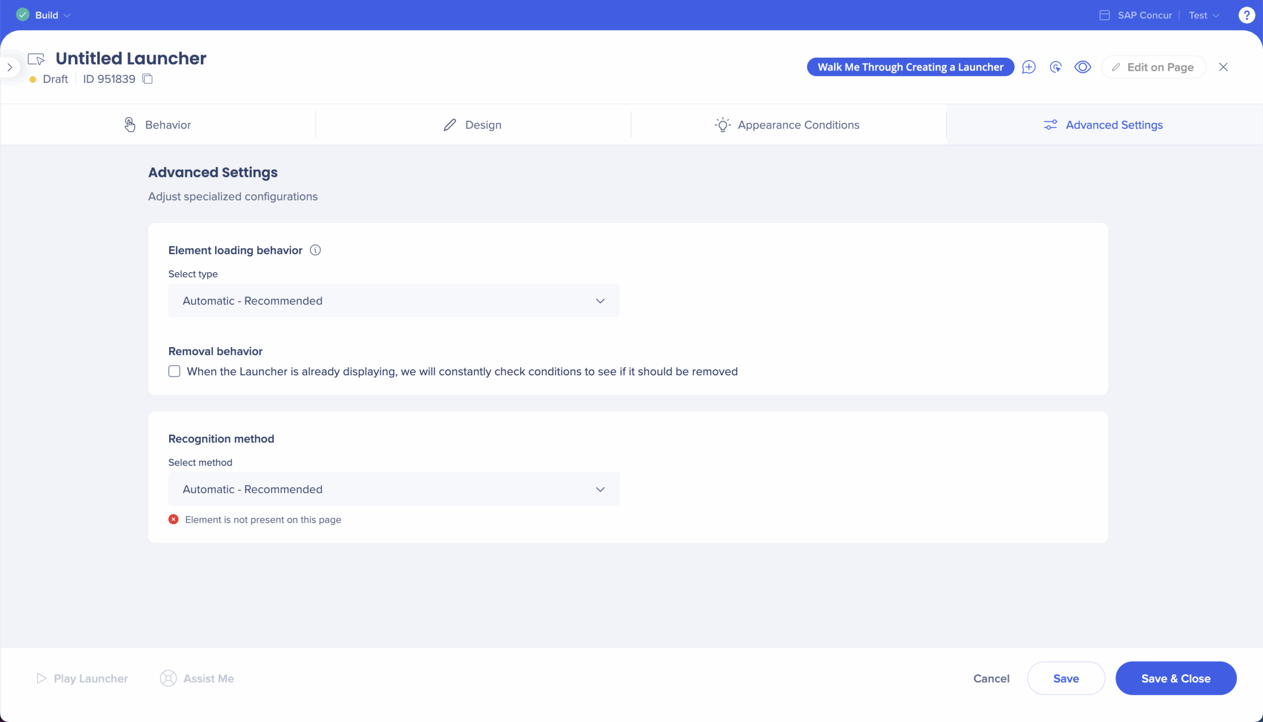 Use the Advanced Settings tab to fine-tune how WalkMe identifies, loads, and removes your launcher on the page.
