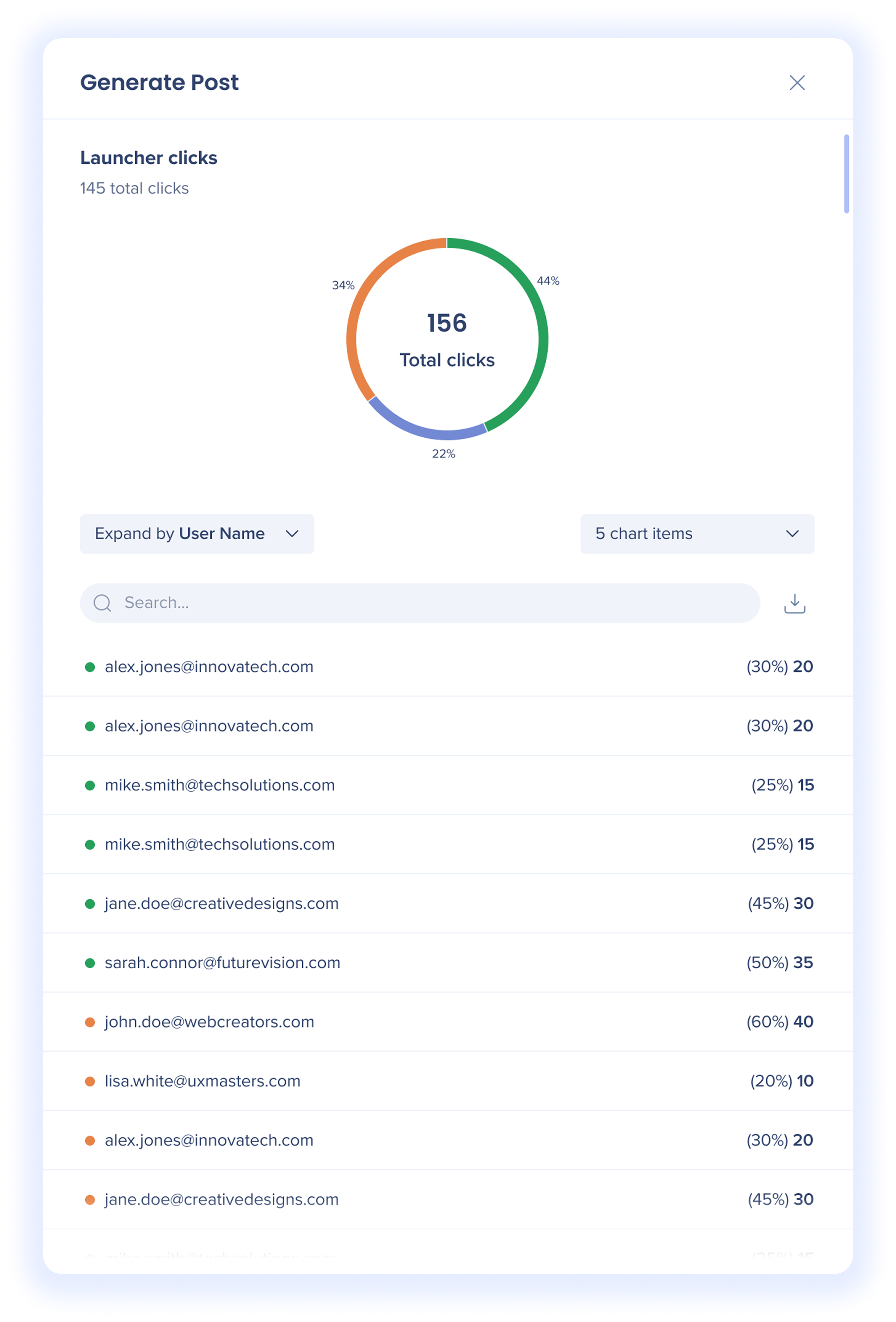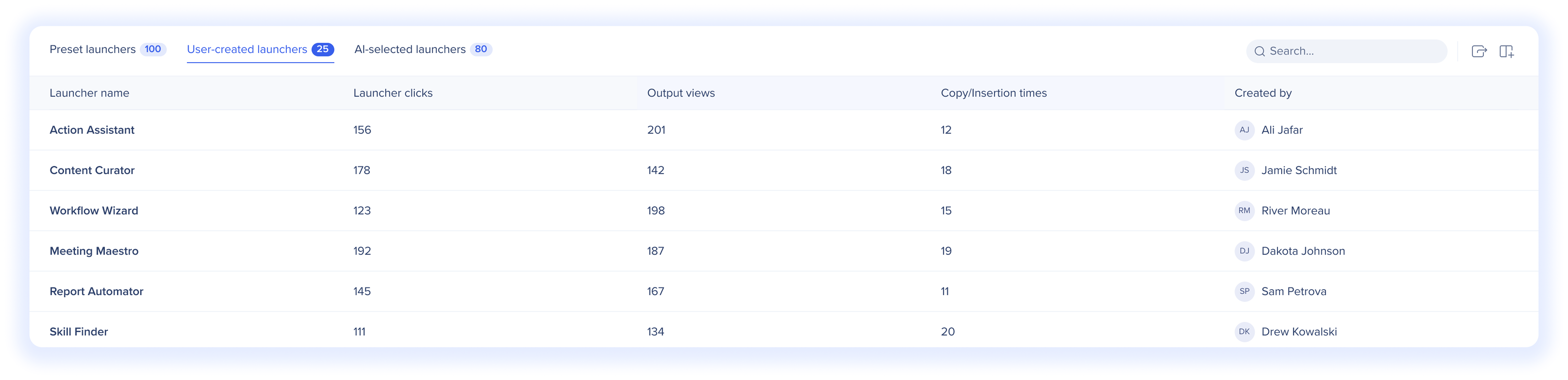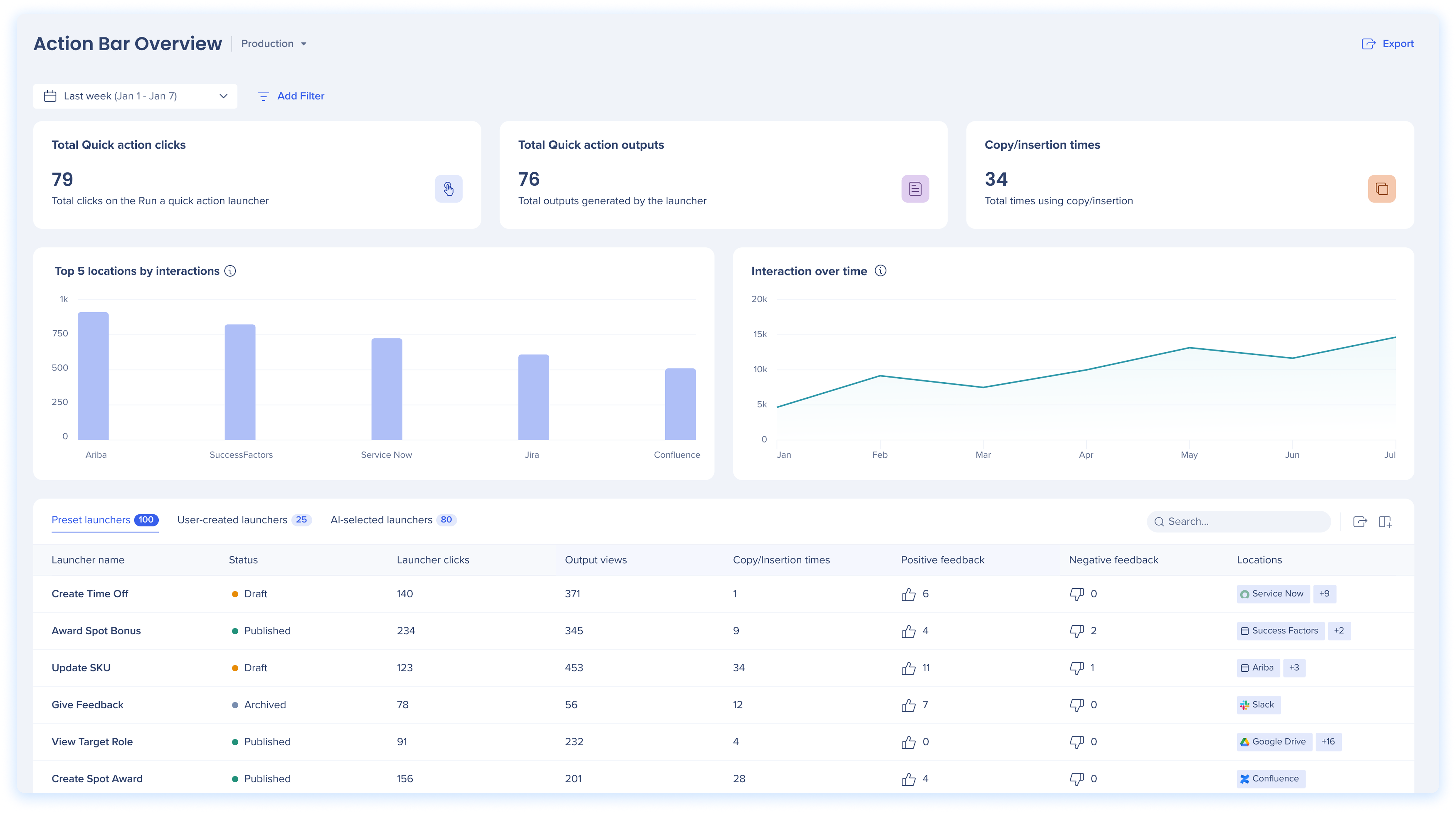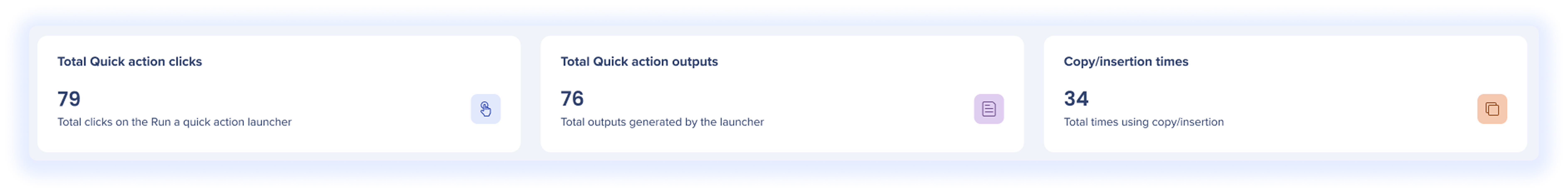 The dashboard aggregates interaction data to show how frequently launchers are exposed to users and how often they result in successful outputs or copies. Learn about the dashboard widgets: