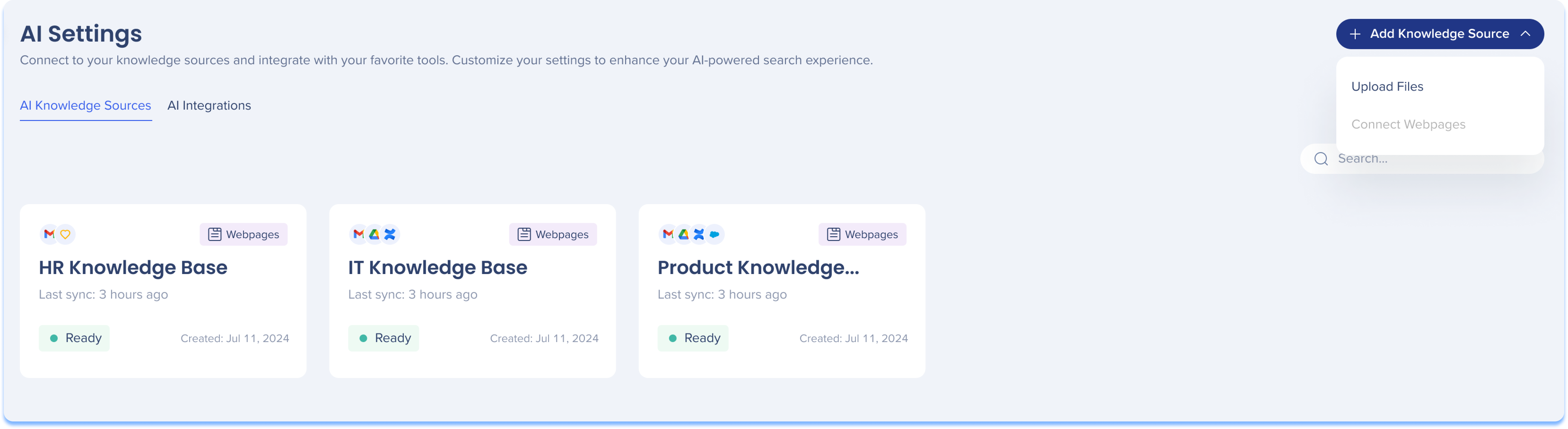 This page provides full control over the knowledge ingestion process. Admins can upload resources, apply user segments to restrict visibility, schedule automated rescans to keep information up to date, and add custom Q&As to resolve content gaps.