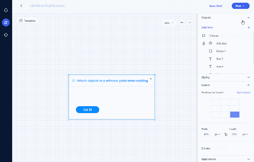 You notification is made up of objects. Objects include: text boxes, images, shapes, and buttons. To edit an object, you can click it in the notification itself or from the Objects list in the design panel. For now, let's review what the panel consists of:
