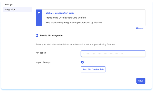 - In Okta, the API Token field must contain the credentials generated in the WalkMe Admin Center