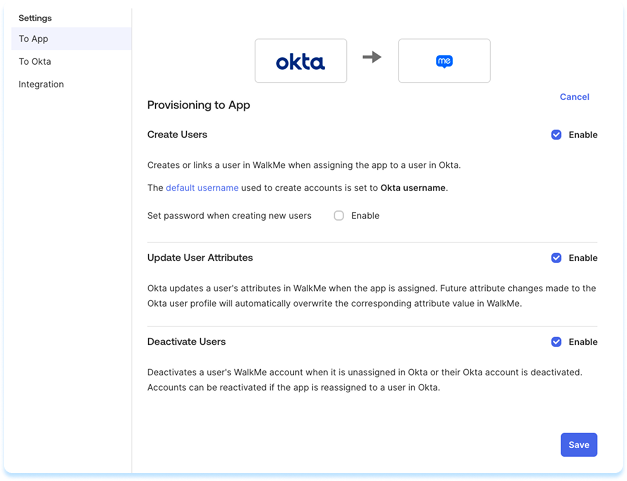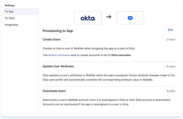 WalkMe is available as an app in the Okta Integration Network, allowing you to enable user provisioning directly through Okta.