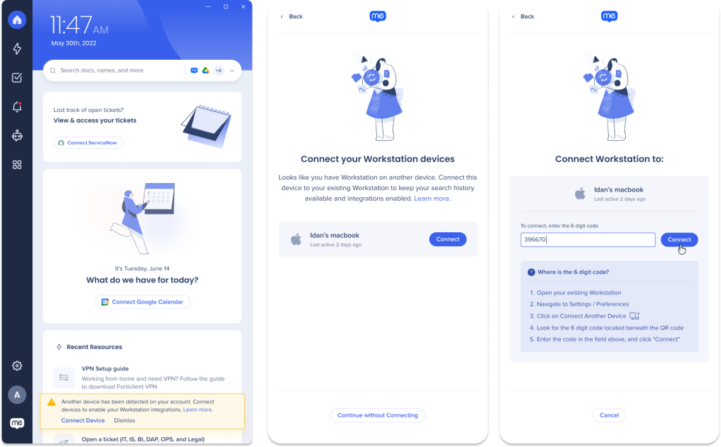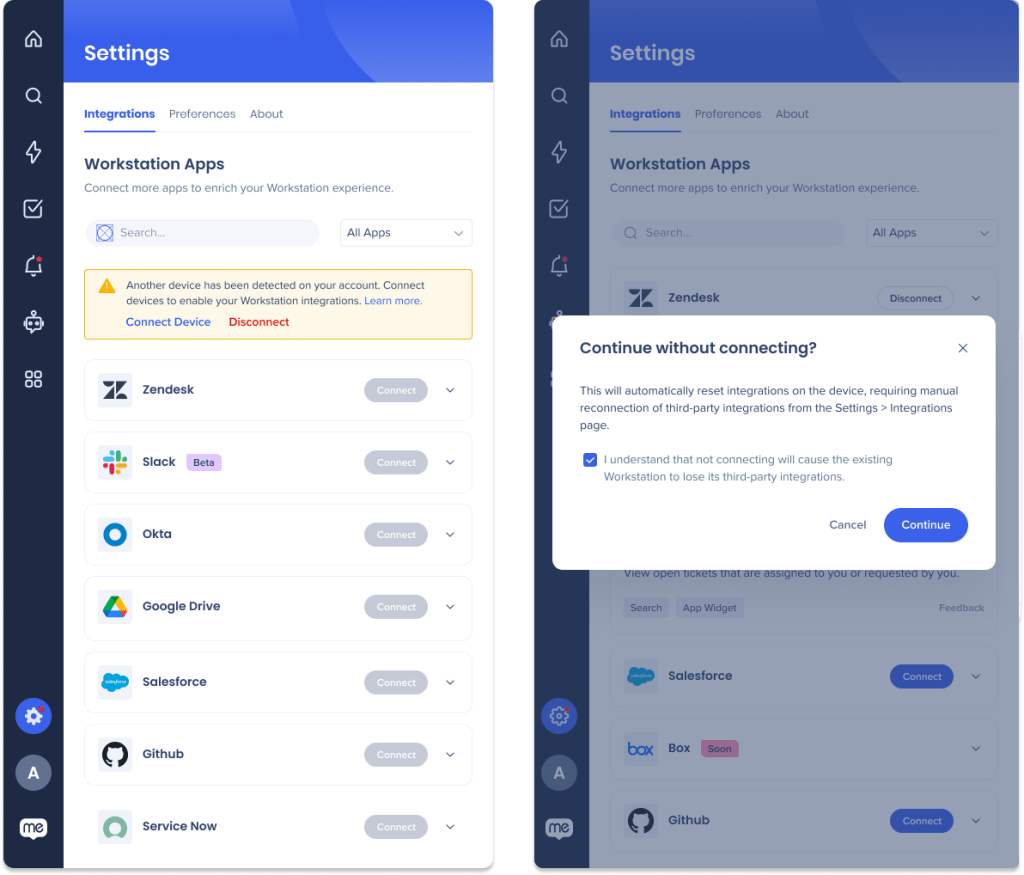 After logging in, you may notice that your integrations are disconnected. If our system detects that another device is connected your account, you'll have the option to connect your devices to enable your integrations.