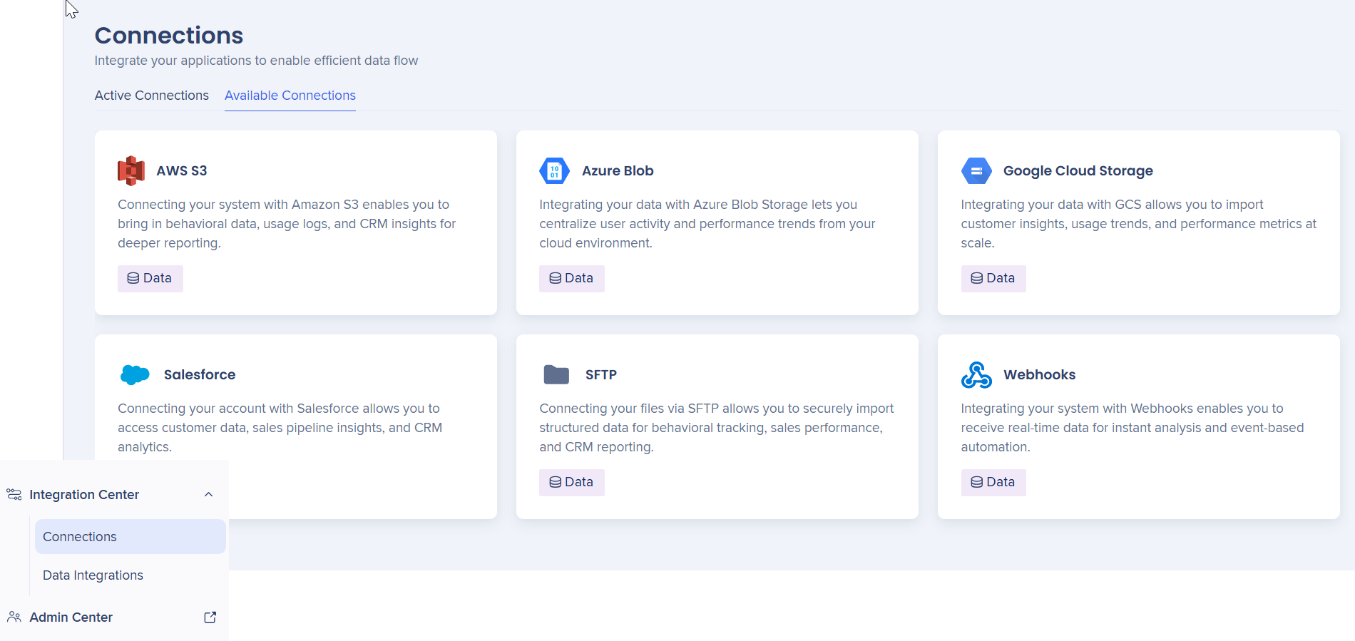 The Connections page in the Integration Center provides a centralized hub for viewing and managing all the connection types your organization connects to. From here, you can open detailed views, add new connections, and manage existing ones with ease. It simplifies connection management by giving you quick access and full control over how your integrations are set up and maintained.