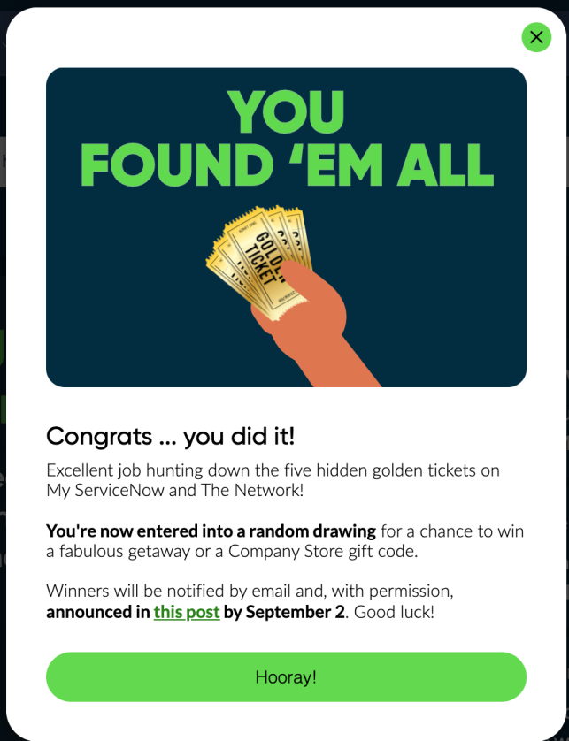 ServiceNow had recently implemented a new internal network platform, as well as new integrated pages with their homegrown system. In order to drive adoption, Anushka created a golden ticket hunt spanning both systems, and participants who found every hidden golden ticket were entered into a prize drawing. Read more about the golden ticket hunt and see it in action here.