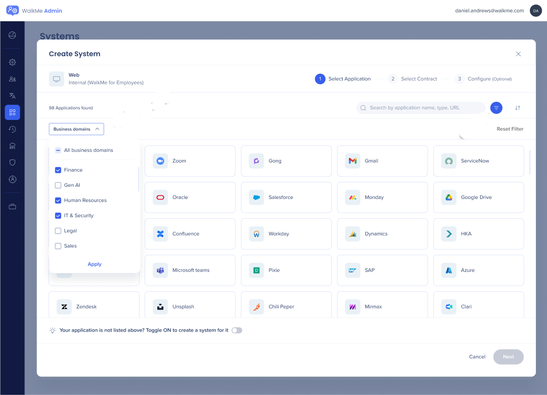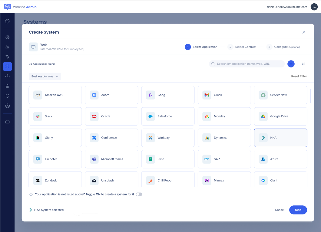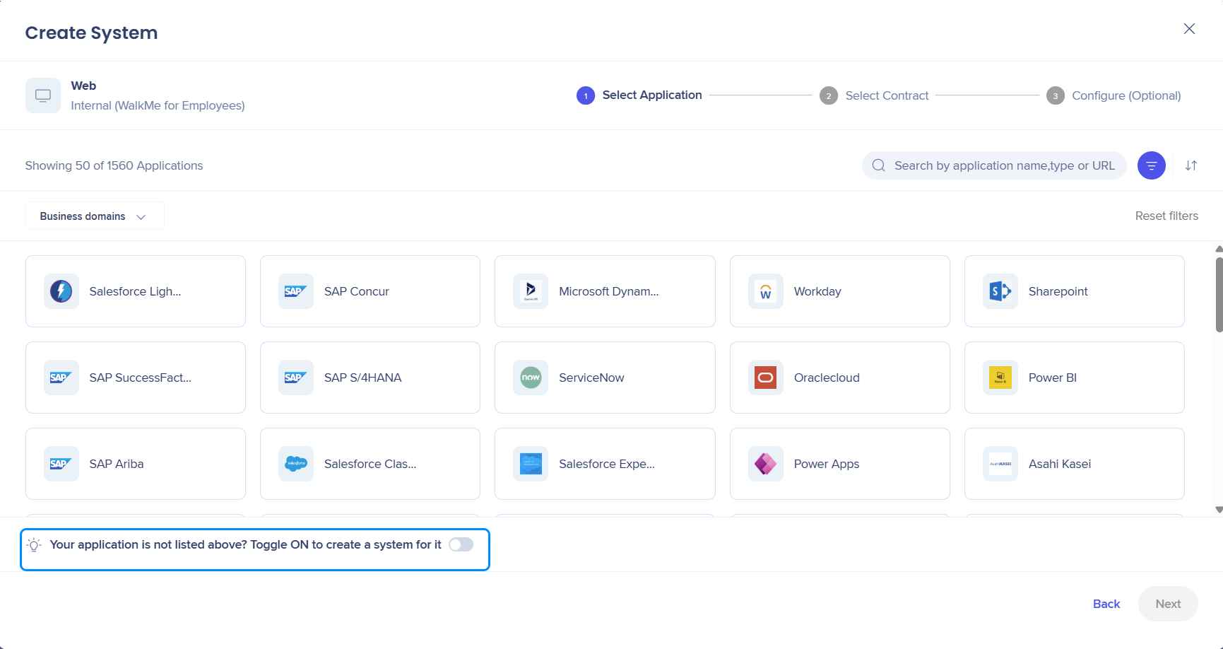 The applications are sorted by popularity, representing the systems most commonly created by all WalkMe customers.