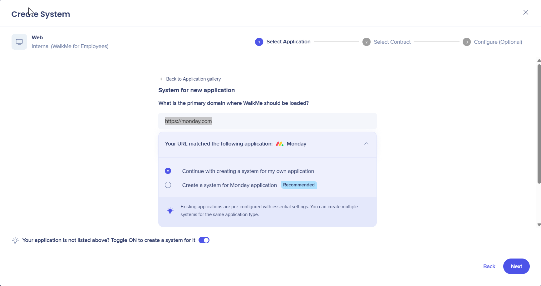 By choosing the second option, we will automatically create an application for the user based on the suggested type, rather than a custom application. The benefit of the second option is that existing applications come pre-configured with essential settings, avoiding the need to contact someone at WalkMe for custom system configuration in the future.
