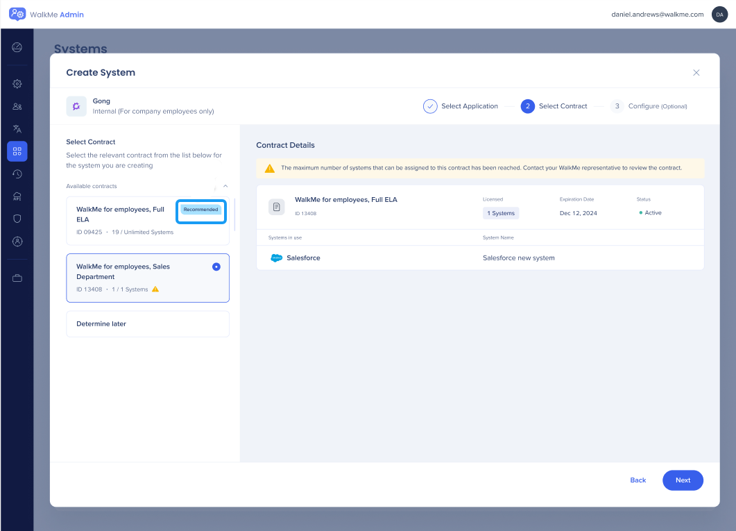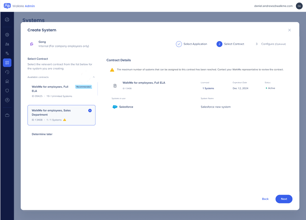 While there won't be a hard stop to assigning a system to the contract by the admin, it's important for the admin to pay attention and contact a WalkMe representative for further steps.