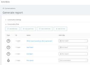 - Create a Conversation, allowing ActionBot to run the following supported processes: