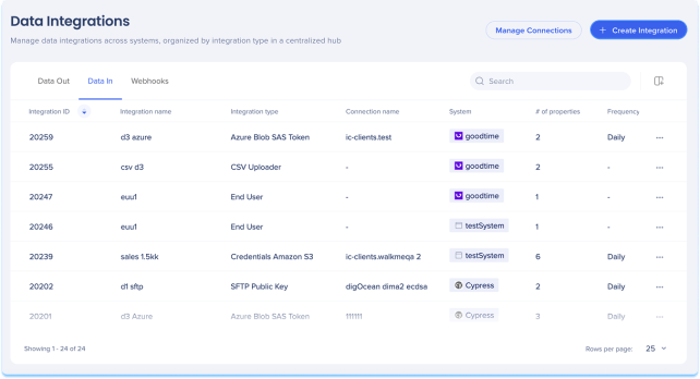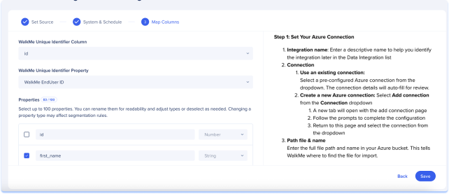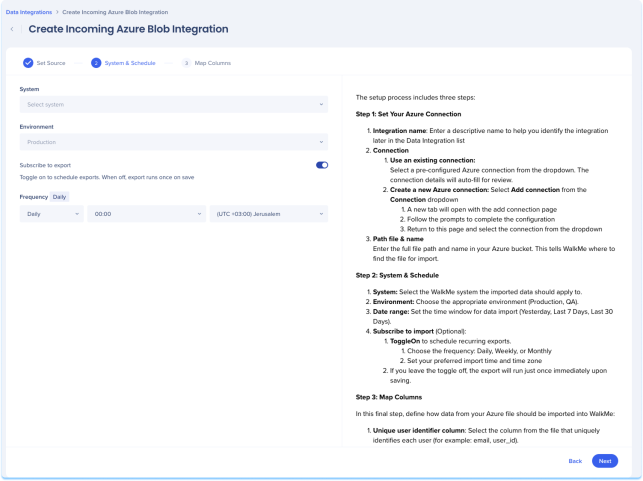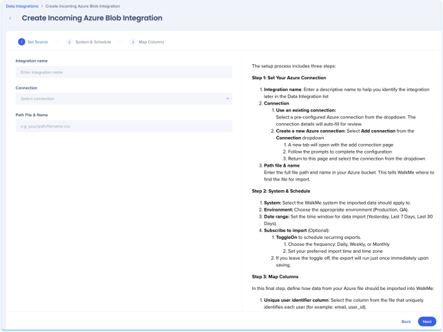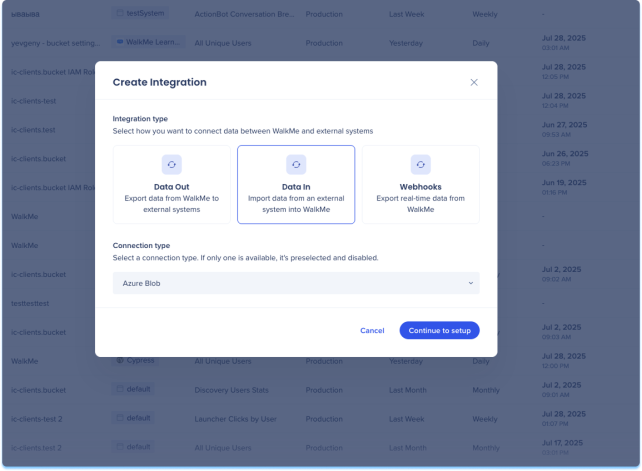 Use the Data Integration Center in the console to import user data from your Azure Blob storage container into WalkMe. Once imported, the data can be used to enrich user profiles, segment content, and personalize the user experience. This integration supports any system that stores files in Azure Blob, making it easy to keep WalkMe updated with user attributes from your internal systems.