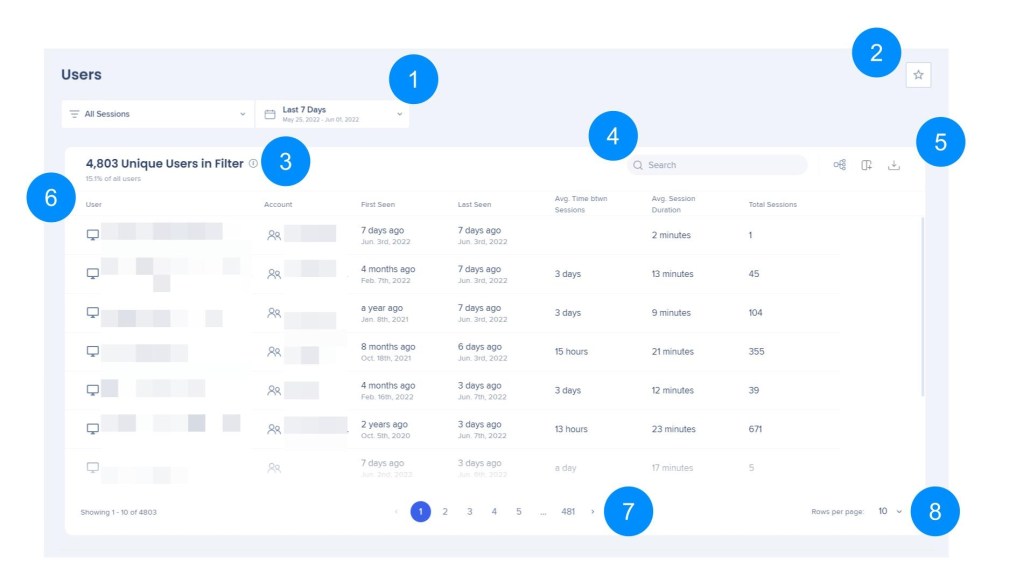 - The Total Sessions column has been filtered to show users who have only had 1 session.