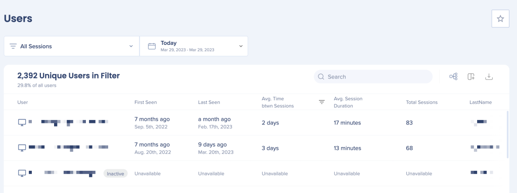 - The Total Sessions column has been filtered to show users who have only had 1 session.