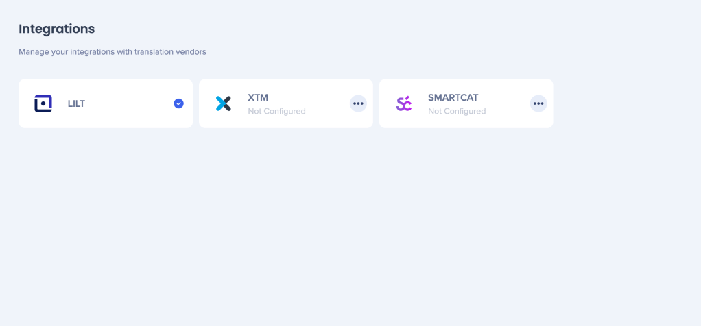 Translation vendors appear as cards on the Integrations page.