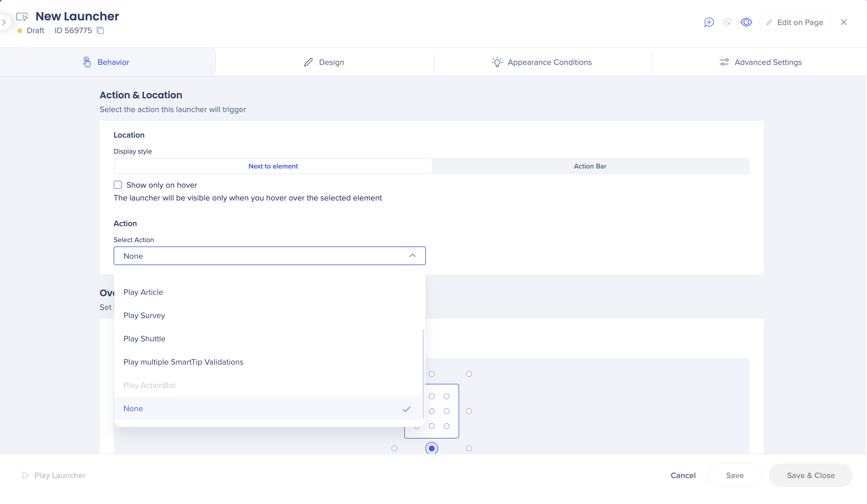 Select the action that this launcher will trigger – start a Smart Walk-Thru, open the menu, play shuttle/resource/ShoutOut etc.