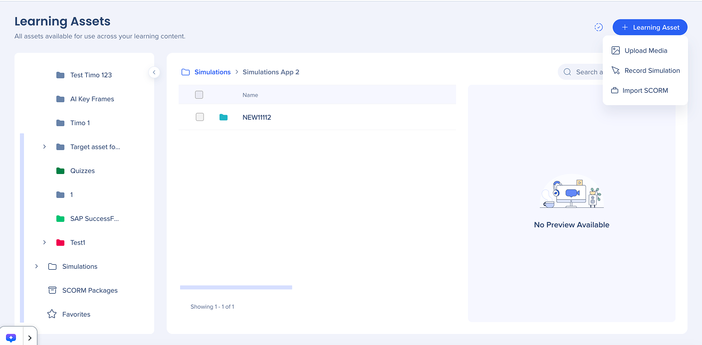 Upload media files or record simulations directly from the Learning Assets page.