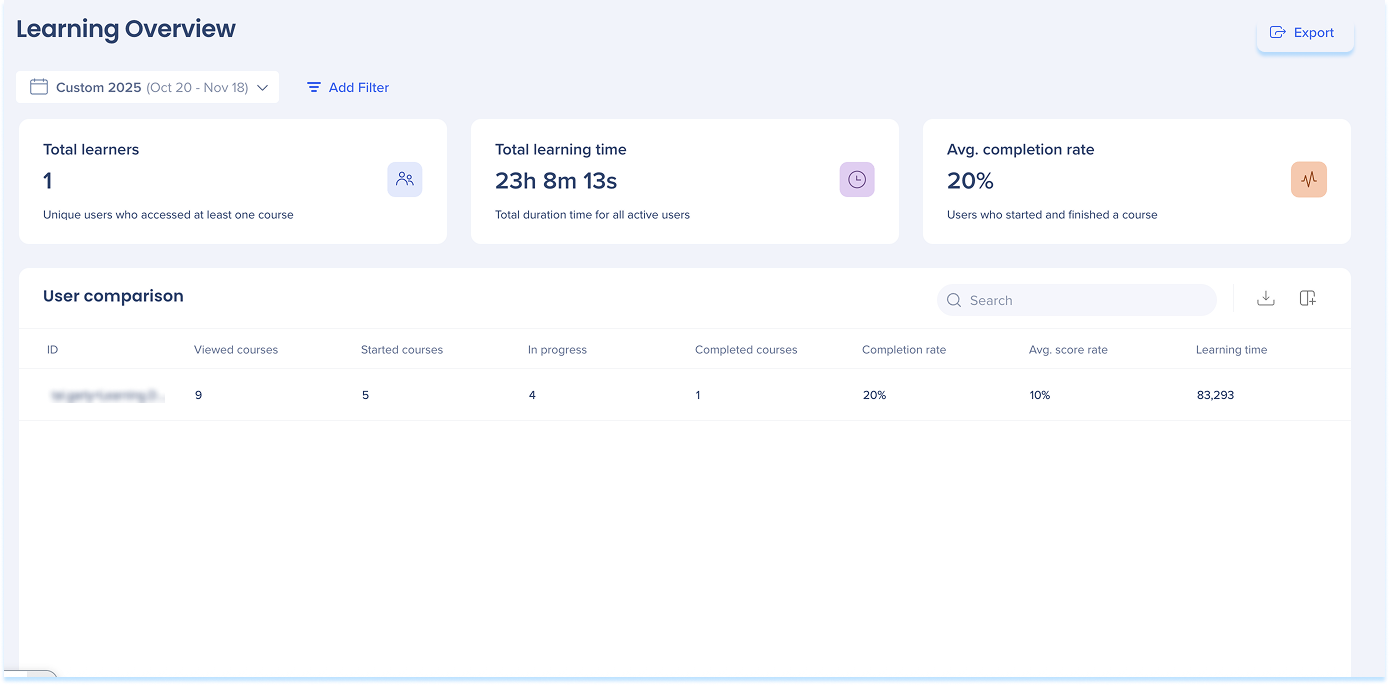 The Learning Overview page helps you track learner engagement and performance across all courses. Use the page to view overall learning trends, monitor completion rates, and identify learners who may need additional support.