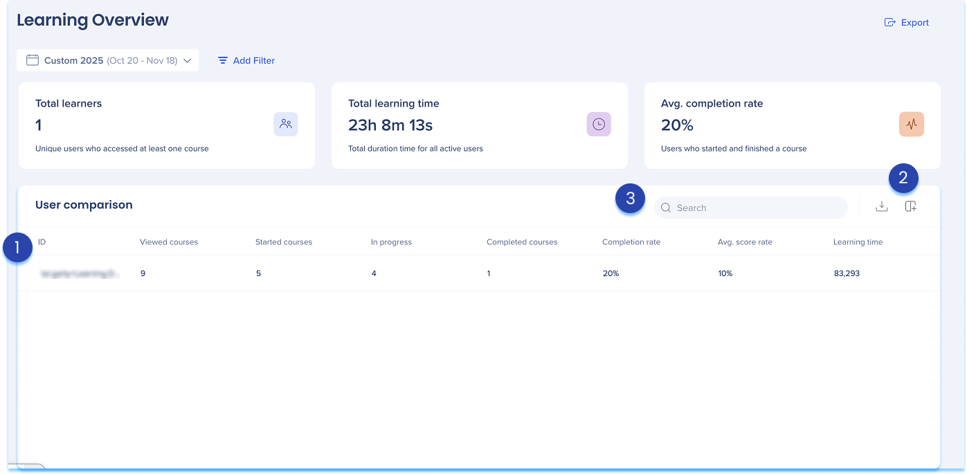 Use this table to compare engagement, progress, and completion rates across all learners.