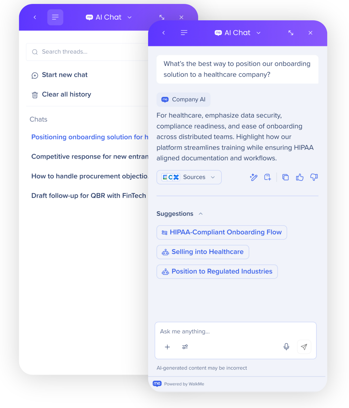 Session Continuity: Maintains conversational history and context across applications, even on pages where WalkMe is not installed