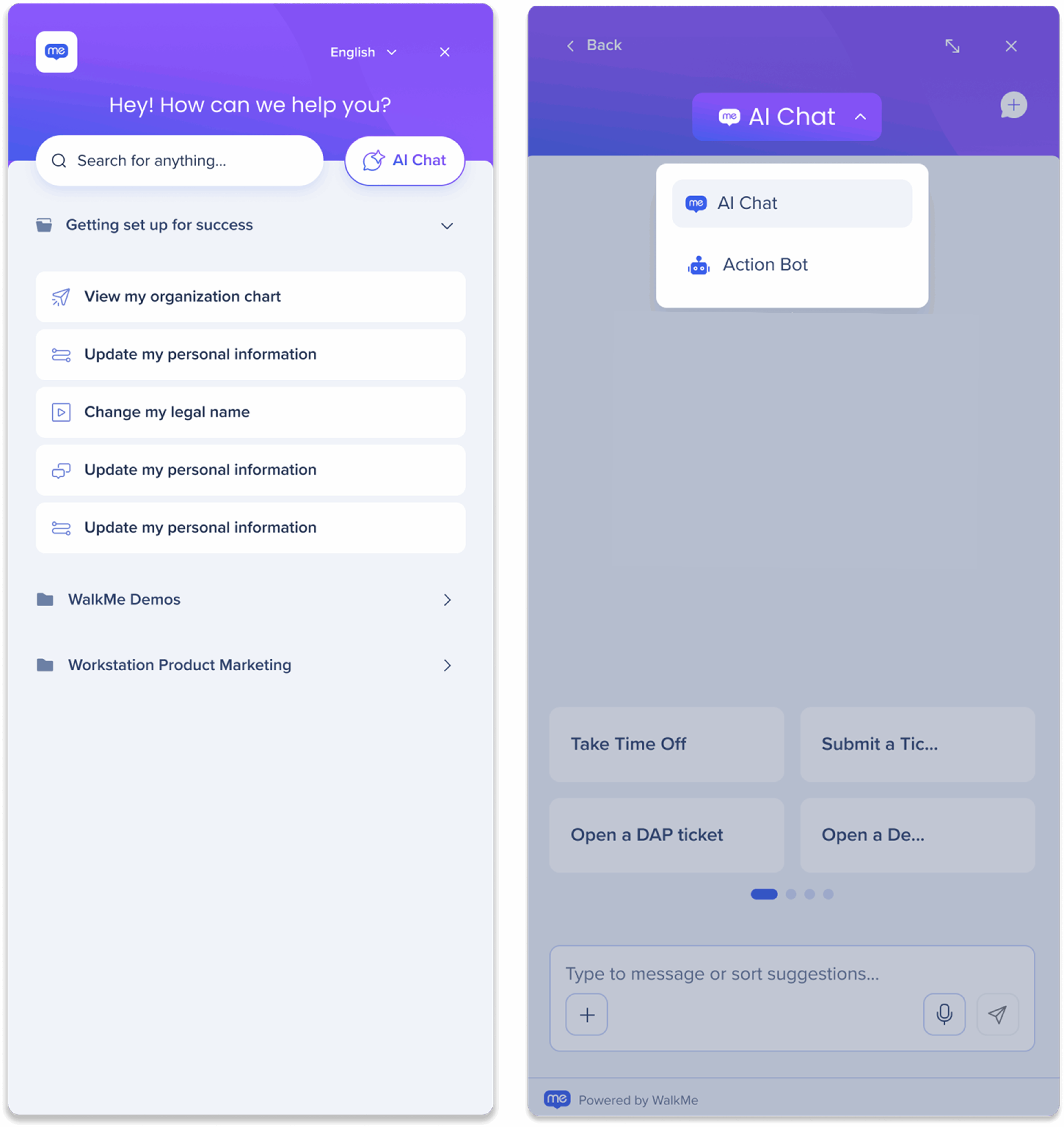 WalkMe's On-Demand AI provides users with reliable, omnipresent access to AI assistance and company resources via a conversational in-app interface. Users can initiate AI-driven support to get tailored responses, retrieve organizational knowledge, and trigger curated actions in real-time.