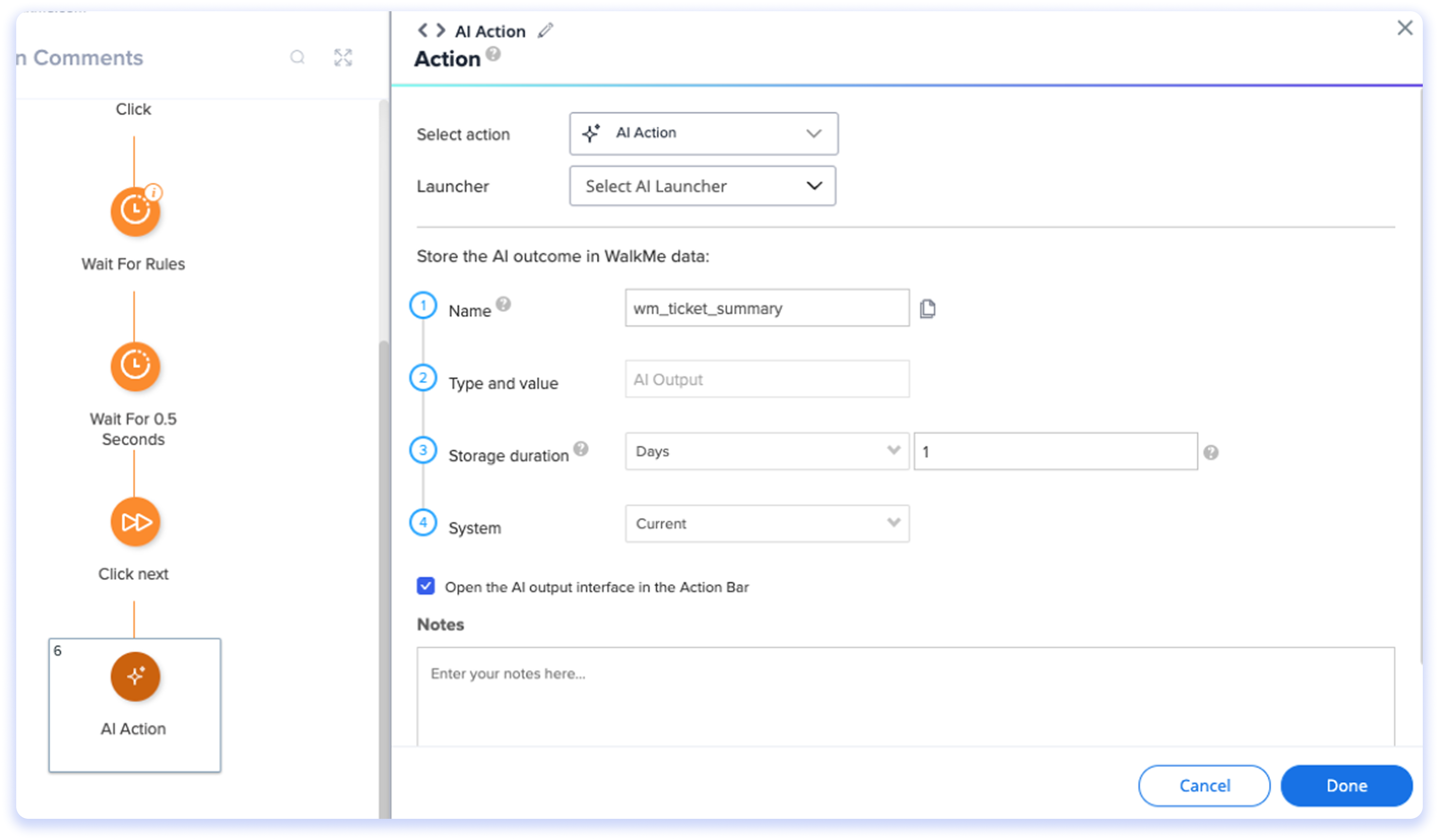 Boost end-user productivity by creating smarter automated processes that seamlessly combine AI actions with your WalkMe guidance.