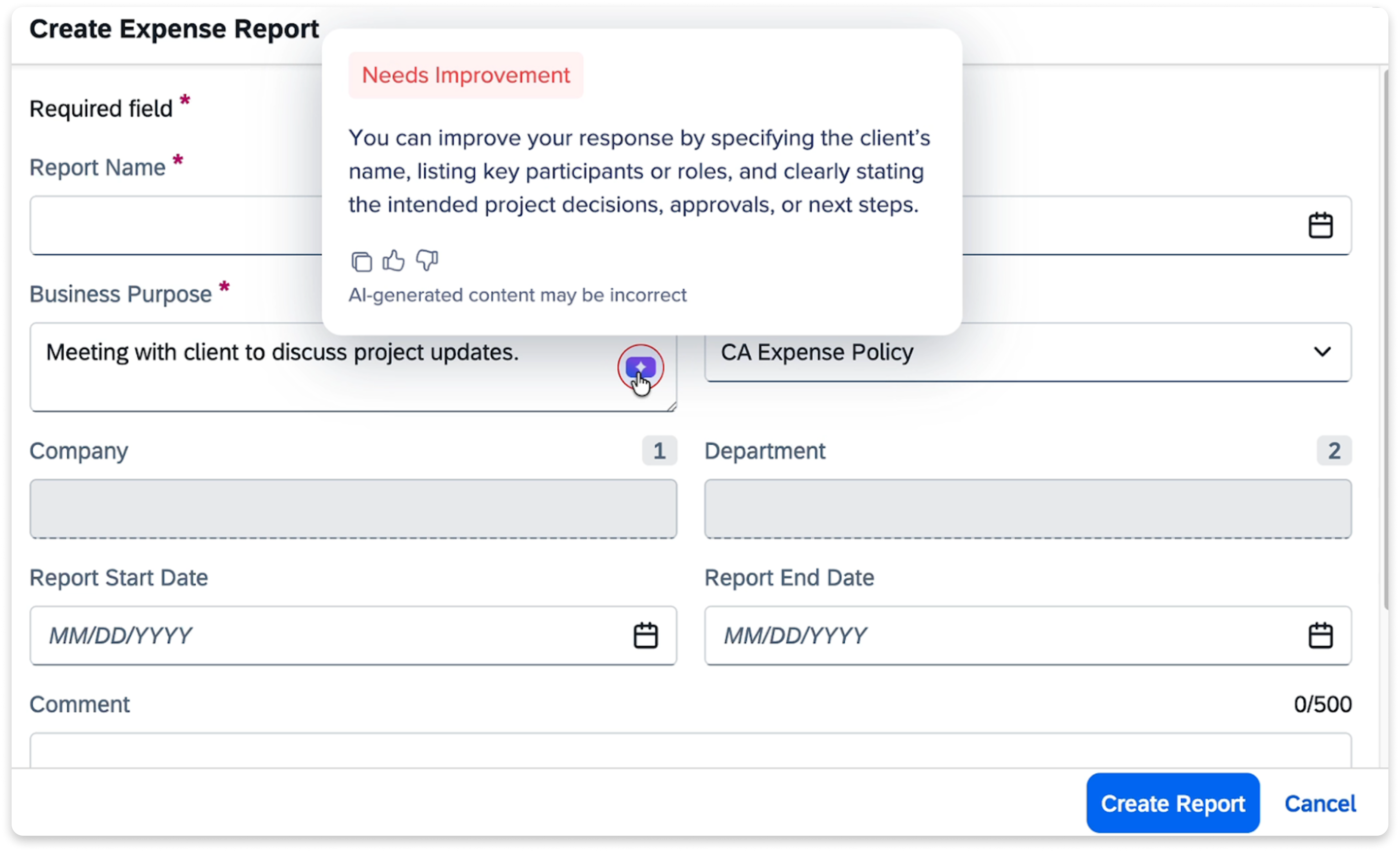AI SmartTips validate and improve text input in open form fields using custom logic and generative AI. They suggest real-time improvements to guide users toward compliant or complete responses.