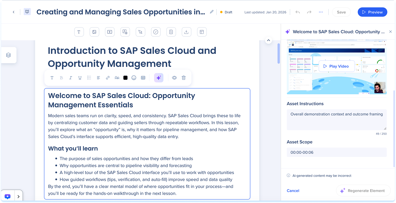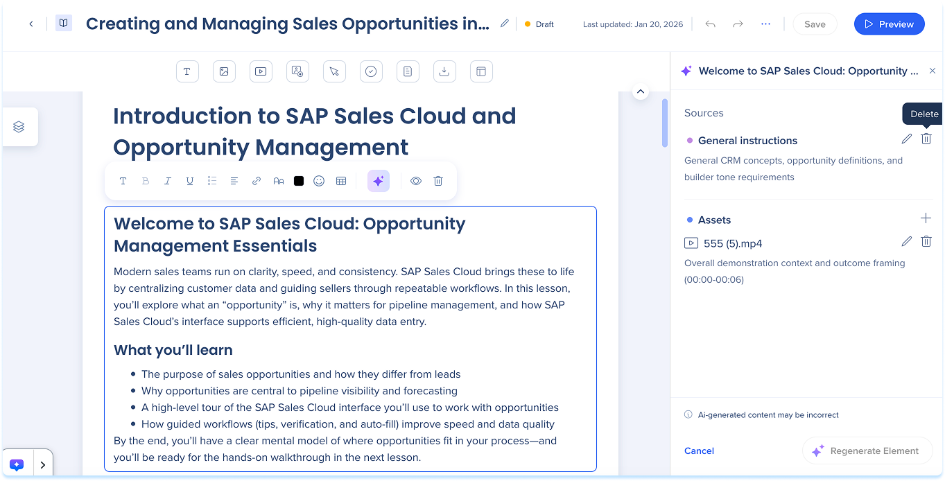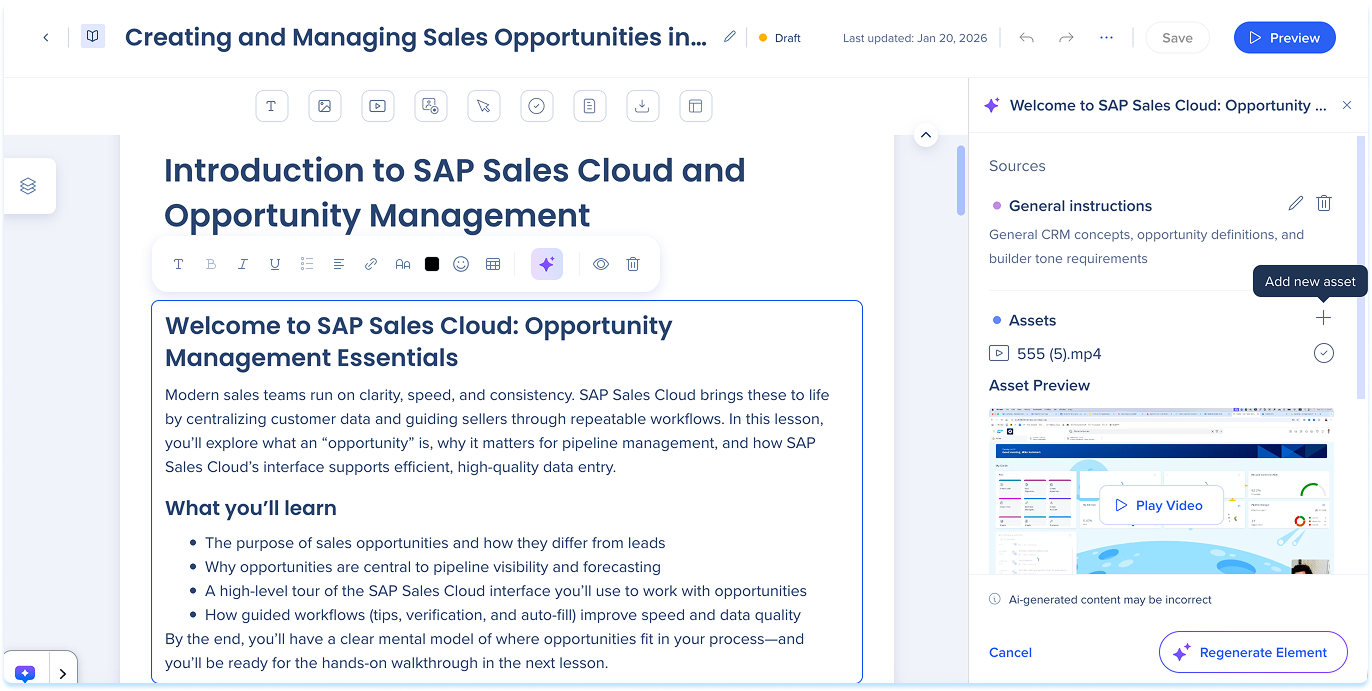 Precision AI authoring helps you update and enhance learning content without regenerating entire courses. Instead of starting over, you can guide the AI to work with specific sources, lessons, sections, or elements, keeping updates focused, accurate, and easier to maintain.