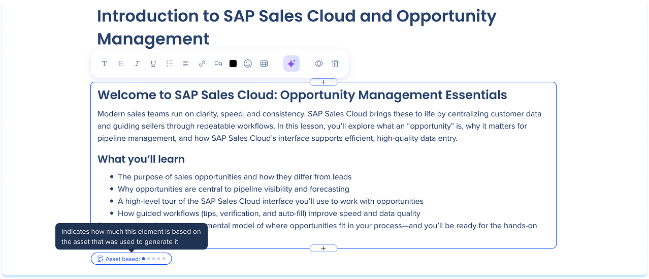Precision AI Authoring uses assets and instructions to give you visibility and control over how content is grounded. For eligible elements, you can see how strongly an element is grounded in assets and refine the output using targeted instructions.