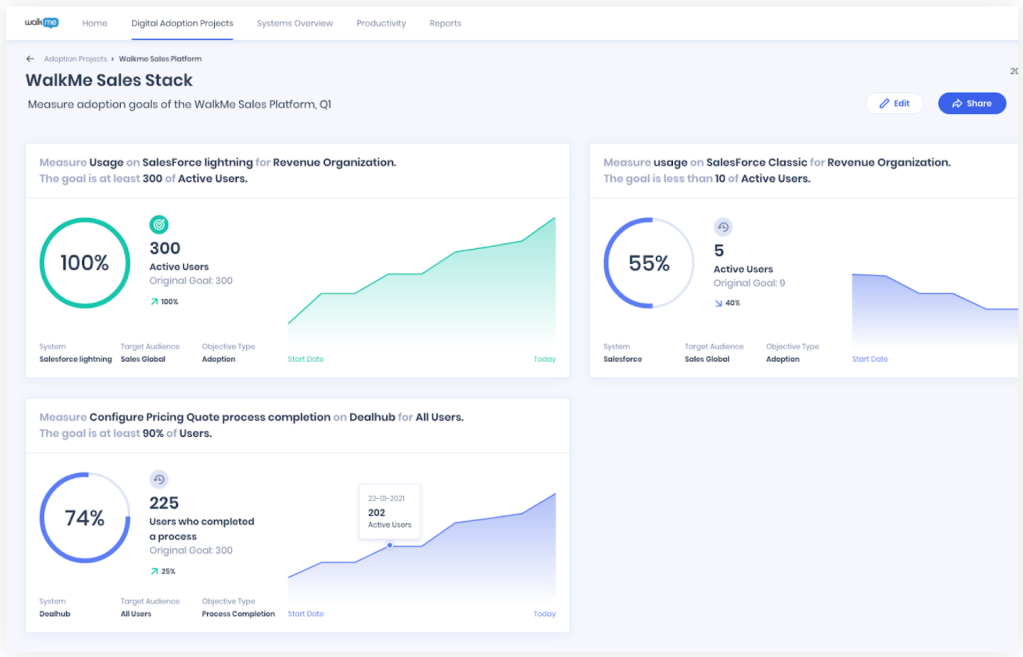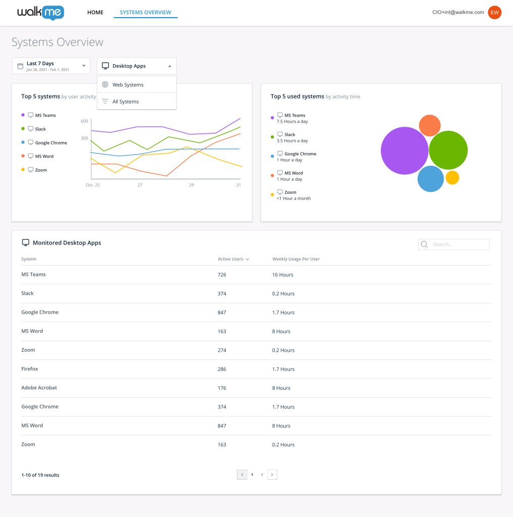 WalkMe's Management Dashboards provide you with visibility into your tech-stack adoption, employee productivity, and the status of strategic digital initiatives. With WalkMe, gain a consolidated view of data from web and desktop systems across your entire organization and make data-driven decisions to propel your digital transformation initiatives forward. Our new Digital Adoption Projects Dashboard and updates to our System Overview Dashboard will continue empowering you and your Executives with the insights needed to drive your digital transformation initiatives forward.